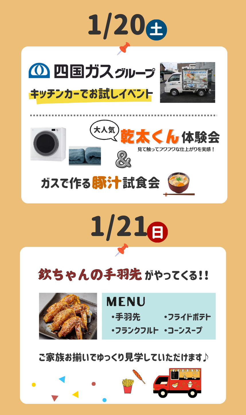 この度、新春イベントとしてキッチンカーや人気のガス乾燥機『乾太くん』体験イベント、さらにステキな来場特典もご用意しております。